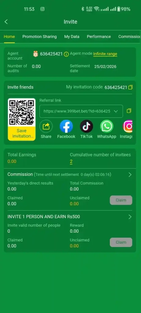 Generate Your Unique Link: Access the “Refer and Earn” section within the 399 Bet game dashboard to locate your personalized invitation URL.